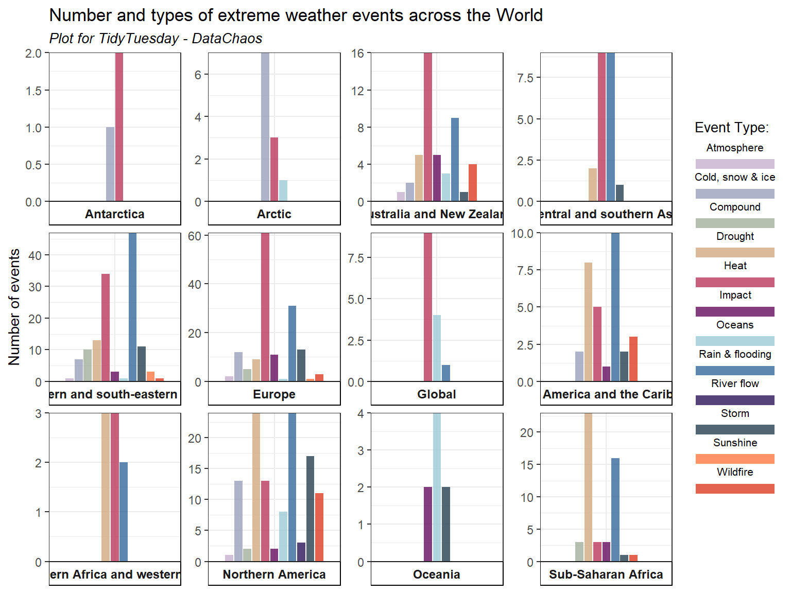 tuesdata <- tidytuesdayR::tt_load('2025-08-12')attribution_studies <- tuesdata$attribution_studieslibrary(tidyverse)atr_event <- attribution_studies %>%filter(study_focus =="Event")paleta <-c("#C5B0CD","#98A1BC","#A2AF9B", "#D1A980","#B9375D", "#640D5F","#9ECAD6", "#34699A", "#2A1458","#273F4F", "#FE7743", "#DC3C22")plot2 <-ggplot((filter(atr_event, cb_region !="Northern hemisphere")), aes(x=cb_region, fill=event_type))+geom_bar(stat="count", position=position_dodge2(preserve="single"), alpha=0.8)+labs(x ="Region", y ="Number of events", fill ="Event Type:",title ="Number and types of extreme weather events across the World",subtitle ="Plot for TidyTuesday - DataChaos") +facet_wrap(~cb_region, scales="free", strip.position="bottom")+scale_y_continuous(expand=c(0,0))+theme_bw()+scale_fill_manual(values=paleta)+guides(fill =guide_legend(label.position ="top"))+theme(axis.text.x =element_blank(),axis.title.x =element_blank(),#strip.placement = "outside",#legend.position = "bottom",strip.background.y =element_rect(fill ="white", color ="white"),strip.background.x =element_rect(fill ="white", color ="black"),strip.text.x =element_text(face="bold", size=9),legend.text =element_text(size =8),legend.title =element_text(size =10),legend.key.size =unit(0.3, "cm"),plot.subtitle =element_text(size=10, face="italic"),axis.ticks.x =element_blank())plot2