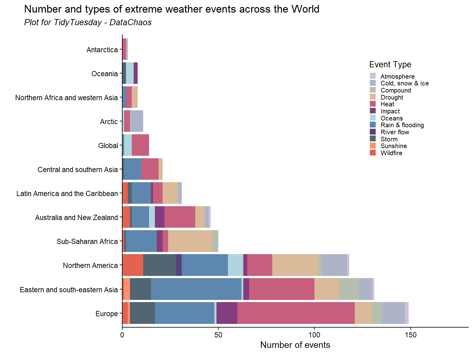 plot <-ggplot(filter(atr_event, cb_region !="Northern hemisphere")) +geom_bar(aes(x = forcats::fct_infreq(cb_region), fill = event_type), alpha=0.8) +labs(x =" ", y ="Number of events", fill ="Event Type", title ="Number and types of extreme weather events across the World",subtitle ="Plot for TidyTuesday - DataChaos") +scale_y_continuous(expand=c(0,0), limits=c(0,180))+theme_classic()+scale_fill_manual(values=paleta)+coord_flip()+theme(legend.position=c(0.8,0.75),legend.text =element_text(size =8),legend.title =element_text(size =10),legend.key.size =unit(0.3, "cm"),plot.title =element_text(margin =margin(l =-120,b=5, unit ="pt")),plot.subtitle =element_text(size=10, face="italic",margin =margin(l =-120,b=10, unit ="pt")))plot