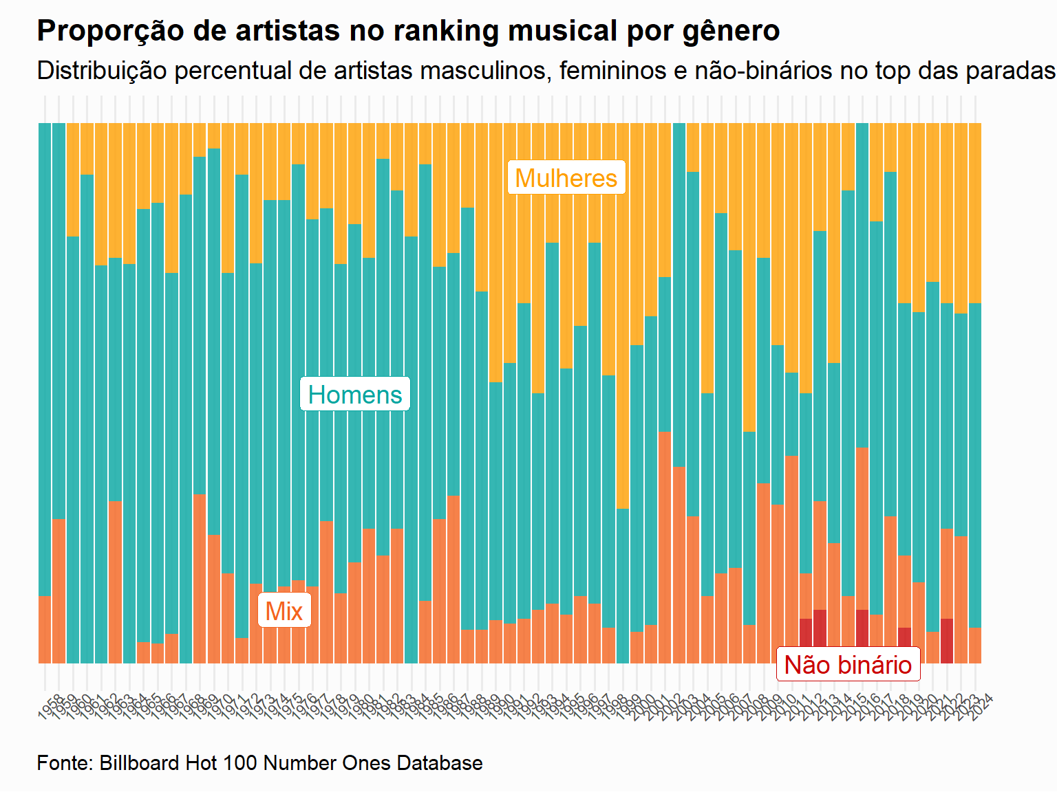 tuesdata <- tidytuesdayR::tt_load('2025-08-26')billboard <- tuesdata$billboardtopics <- tuesdata$topicsbillboard <- billboard %>%mutate(year =year(date)) %>%mutate(decade =factor(year %/%10*10))p1 <-ggplot(filter(billboard, year !="2025"), aes(x =factor(year), fill =factor(artist_male))) +geom_bar(position ="fill", alpha=0.8) +labs(x ="Ano", y ="Proporção de artistas", fill ="Gênero",title ="Proporção de artistas no ranking musical por gênero",subtitle =str_wrap("Distribuição percentual de artistas masculinos, femininos e não-binários no top das paradas musicais de 1958-2024", 140),caption ="Fonte: Billboard Hot 100 Number Ones Database") +scale_fill_manual(values=c("#FF9F00","#03A6A1","#F4631E", "#CB0404"), labels =c("Mulheres", "Homens", "Mix", "Não-binários")) +theme_minimal(base_size =14)+theme(axis.text.x =element_text(angle=45, vjust=1, size=8),legend.position ="none",plot.background =element_rect(fill ="grey99", color =NA),axis.title =element_blank(),axis.text.y =element_blank(),panel.grid.major.y =element_blank(),panel.grid.minor.y =element_blank(),plot.title =element_text(face ="bold", size =16),plot.subtitle =element_text(lineheight =1),plot.caption =element_text(margin =margin(10, 0, 0, 0), hjust =0),plot.margin =margin(10, 40, 10, 20))+annotate(geom ="label", x="1995", y =0.9, label ="Mulheres", fill="white", color="#FF9F00")+annotate(geom ="label", x="1980", y =0.5, label ="Homens", fill="white", color="#03A6A1")+annotate(geom ="label", x="1975", y =0.1, label ="Mix", fill="white", color="#F4631E")+annotate(geom ="label", x="2015", y =0, label ="Não binário", fill="white", color="#CB0404")p1