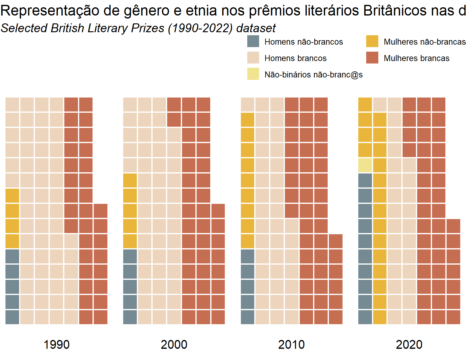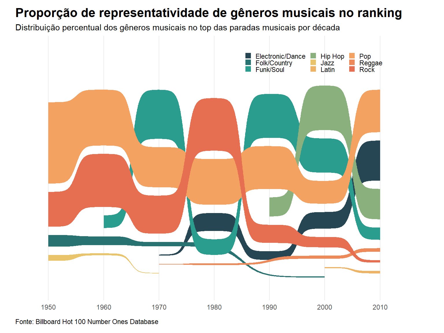 sankey.data <- billboard %>%select(year,decade, cdr_genre, songwriter_male, artist_male, songwriter_white, artist_white) %>%mutate(songwriter_gender =case_when(songwriter_male ==0~"Mulher", songwriter_male ==1~"Homem", songwriter_male ==2~"Mix", songwriter_male ==3~"Não-binário"),artist_gender =case_when(artist_male ==0~"Mulher", artist_male ==1~"Homem", artist_male ==2~"Mix", artist_male ==3~"Não-binário"),songrwriter_race =case_when(songwriter_white ==0~"Não branco", songwriter_white ==1~"Branco", songwriter_white ==2~"Mix"),artist_race =case_when(artist_white ==0~"Não branco", artist_white ==1~"Branco", artist_white ==2~"Mix"))library(ggsankey)sankey.data.flow <-na.omit(sankey.data) %>%mutate(cdr_genre =str_remove(cdr_genre, ";.*")) %>%group_by(decade) %>%mutate(decade_n =n()) %>%ungroup() %>%group_by(decade, cdr_genre) %>%summarise(n =n(), decade_n, prop = n / decade_n) %>%distinct()pal <-c("#264653","#287271", "#2a9d8f", "#8ab17d", "#e9c46a", "#efb366","#f4a261","#ee8959","#e76f51")p2 <-ggplot(sankey.data.flow, aes(x = decade, node = cdr_genre, fill = cdr_genre, value = prop, label = cdr_genre)) +geom_sankey_bump() +scale_fill_manual(values=pal)+labs( title ="Proporção de representatividade de gêneros musicais no ranking",subtitle =str_wrap("Distribuição percentual dos gêneros musicais no top das paradas musicais por década", 140),caption ="Fonte: Billboard Hot 100 Number Ones Database") +theme_minimal() +ylim(-0.8,1)+guides(fill =guide_legend(nrow =3))+theme(legend.title =element_blank(),axis.title =element_blank(),axis.text.y =element_blank(),legend.position =c(0.75,0.9),panel.background =element_rect(fill ="transparent", color =NA),plot.background =element_rect(fill ="transparent", color =NA),panel.grid.major.y =element_blank(),panel.grid.minor.y =element_blank(),plot.title =element_text(face ="bold", size =16),plot.subtitle =element_text(lineheight =1),plot.caption =element_text(margin =margin(10, 0, 0, 0), hjust =0),plot.margin =margin(10, 40, 10, 20),legend.key.size =unit(0.3, "cm"))p2