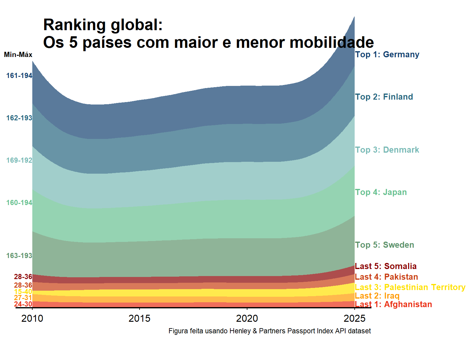 tuesdata <- tidytuesdayR::tt_load('2025-09-09')rank_by_year <- tuesdata$rank_by_yearlowest.rank <- rank_by_year %>%group_by(country) %>%summarise_if(is.numeric, mean) %>%slice_max(order_by = rank, n =5)lowest <- rank_by_year %>%filter(country %in% lowest.rank$country)highest.rank <- rank_by_year %>%group_by(country) %>%summarise_if(is.numeric, mean) %>%slice_min(order_by = rank, n =5)highest <- rank_by_year %>%filter(country %in% highest.rank$country)toplow <- lowest %>%full_join(highest)library(ggridges)toplow$country <-factor(toplow$country, levels=c("Afghanistan","Iraq","Palestinian Territory","Pakistan","Somalia","Sweden","Japan","Denmark","Finland","Germany"))library(forcats)library(ggstream)toplow$country <-fct_rev(toplow$country)paleta <-c("#124170", "#26667F","#78B9B5", "#67C090", "#5E936C", "#8A0000", "#C83F12","#FFE100","#FF9B00", "#EA2F14")plot <-ggplot(filter(toplow, year>=2010), aes(year, visa_free_count, fill = country)) +geom_stream(type ="ridge" ,bw=1, alpha=0.7)+scale_fill_manual(values=paleta) +scale_y_continuous(expand =c(0,0)) +scale_x_continuous(breaks=c(2010,2015,2020,2025),labels =c("2010","2015","2020","2025")) +coord_cartesian(clip ="off") +theme_classic()+labs(caption ="Figura feita usando Henley & Partners Passport Index API dataset")+theme(axis.title =element_blank(), axis.line.x=element_line(linewidth =0.75),axis.line.y=element_blank(),axis.ticks.y=element_blank(),plot.margin =margin(20,120,20,20),legend.position="none",panel.grid =element_blank(),axis.text.y=element_blank(),axis.text.x =element_text(size=12,margin =margin(5,0,0,0)))+annotate("text", x =2025, y =c(1200, 1000, 750,550,300,200,150,100,60,20),label =c("Top 1: Germany","Top 2: Finland","Top 3: Denmark","Top 4: Japan","Top 5: Sweden","Last 5: Somalia","Last 4: Pakistan","Last 3: Palestinian Territory","Last 2: Iraq","Last 1: Afghanistan"),hjust=0,size=3.5,lineheight=.8,fontface="bold",color=paleta)+annotate("text", x =2010.5, y =1300,label ="Ranking global:\nOs 5 países com maior e menor mobilidade",hjust=0,size=7,lineheight=.9,fontface="bold",color="black")+annotate("text", x =2010, y =c(1200, 1100,900, 700,500,250,150,110,80,50,20),label =c("Min-Máx","161-194","162-193","169-192","160-194","163-193","28-36","28-36","15-40","27-31","24-30"),hjust=1,size=3,lineheight=.8,fontface="bold", color=c("black","#124170", "#26667F","#78B9B5", "#67C090", "#5E936C", "#8A0000", "#C83F12","#FFE100","#FF9B00", "#EA2F14"))plot