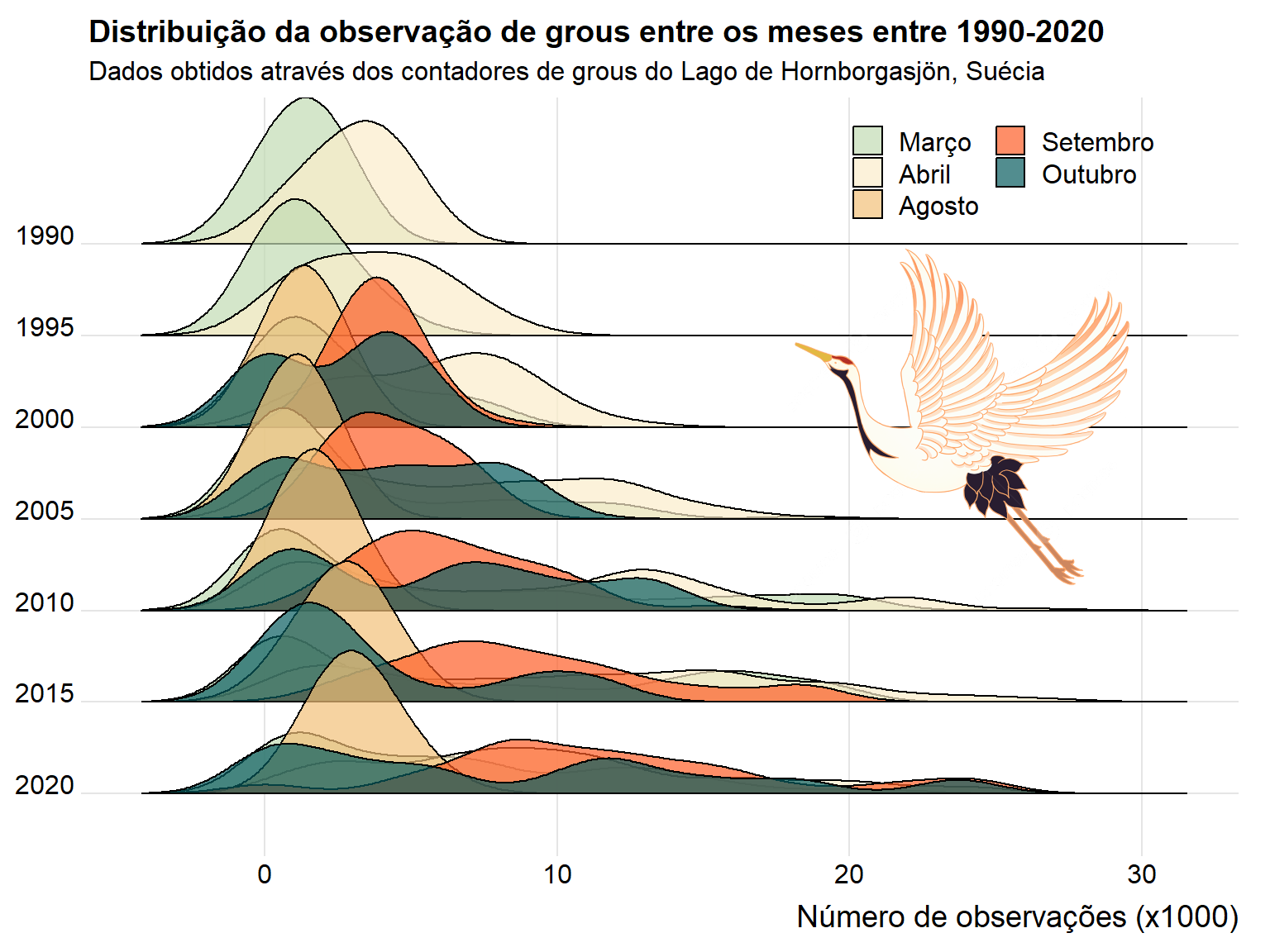 tuesdata <- tidytuesdayR::tt_load('2025-09-30')cranes <- tuesdata$cranescranes <- cranes %>%mutate(year =year(date)) %>%mutate(interval =factor(year %/%5*5)) %>%mutate(month =month(date))library(ggridges)cranes_clean <- cranes %>%filter(!is.na(observations)) library(png)library(grid)crane_png <-readPNG("crane.png")crane_grob <-rasterGrob(crane_png, interpolate =TRUE)final <-ggplot(cranes_clean, aes(x=observations/1000, fill=as.factor(month), y=fct_rev(interval))) +geom_density_ridges2(alpha=0.7)+labs(x ="Número de observações (x1000)",y ="Intervalos",title ="Distribuição da observação de grous entre os meses entre 1990-2020",subtitle ="Dados obtidos através dos contadores de grous do Lago de Hornborgasjön, Suécia" ) +scale_fill_manual(values=c("#C1DBB3","#FAEDCA", "#F2C078","#FE5D26", "#075B5E"),labels =c("Março", "Abril", "Agosto", "Setembro", "Outubro"),name ="Mês")+theme_ridges()+guides(fill=guide_legend(ncol=2))+theme(legend.position =c(0.65,0.9), legend.title =element_blank(),axis.title.y =element_blank())+annotation_custom(crane_grob, xmin=17, xmax=30, ymin="2010", ymax="1990")final