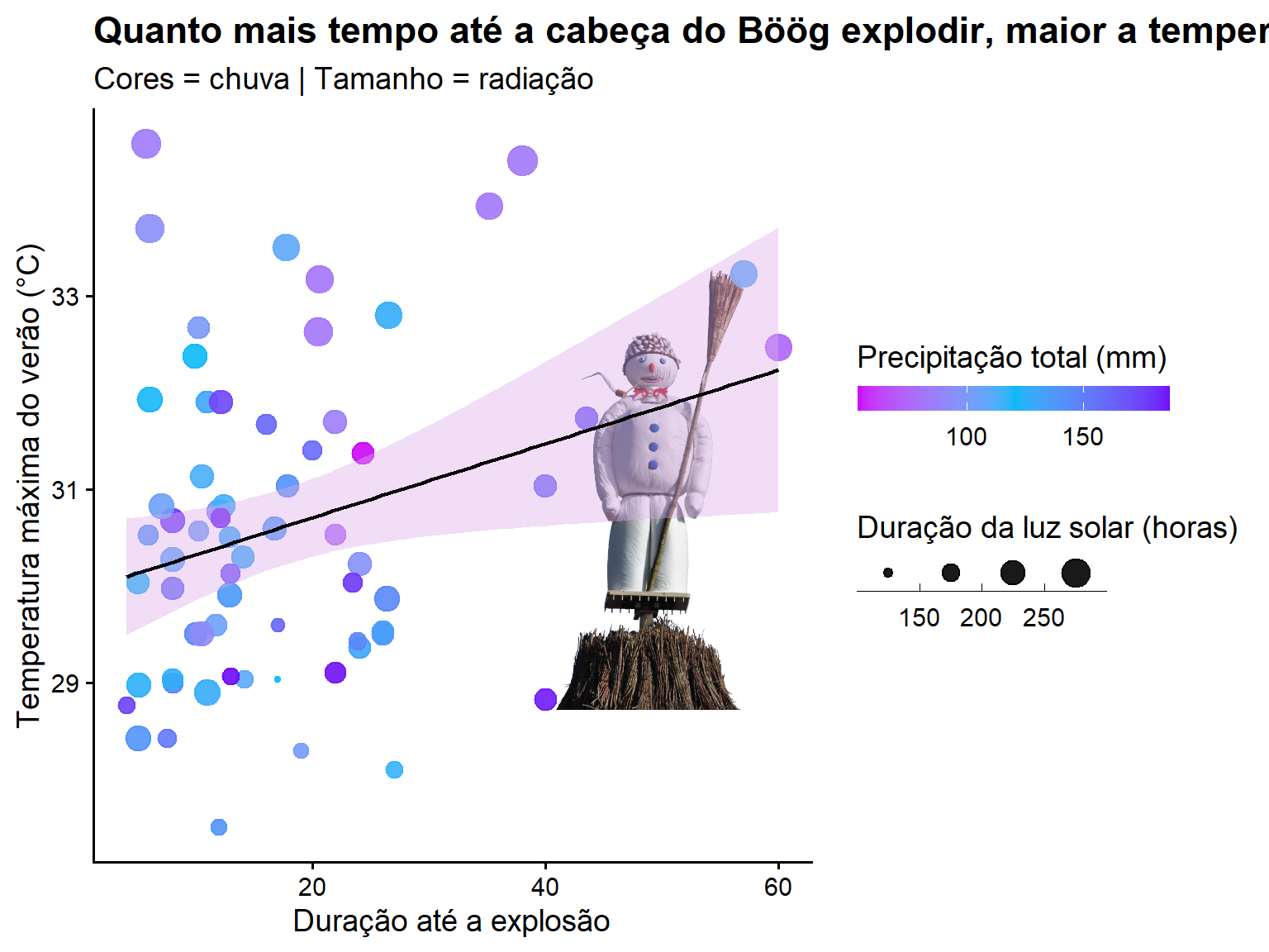 library(png)library(grid)img <-readPNG("boog.png")g <-rasterGrob(img, interpolate =TRUE)plot <-ggplot(sech, aes(duration,tre200mx))+annotation_custom(g, xmin =40, xmax =68,ymin =27, ymax =35)+geom_point(aes(colour=rre150m0, size=sre000m0), alpha =0.9)+geom_smooth(method="lm", se =TRUE,colour ="black",fill="#DCA9E8",linewidth =0.8)+labs(x="Duração até a explosão", y="Temperatura máxima do verão (°C)",title ="Quanto mais tempo até a cabeça do Böög explodir, maior a temperatura do verão",subtitle ="Cores = chuva | Tamanho = radiação")+scale_size_continuous(name ="Duração da luz solar (horas)",guide =guide_bins(direction ="horizontal",barheight =unit(4, "mm"),barwidth =unit(10, "mm"),title.position ="top"))+scale_color_gradient2(low ="#CC07FA", high ="#7007FA", mid ="#07B9FA", midpoint =120,name ="Precipitação total (mm)",guide =guide_colorbar(direction ="horizontal",barheight =unit(4, "mm"),barwidth =unit(50, "mm"),title.position ="top")) +theme_classic(base_size =14) +theme(plot.title =element_text(face ="bold"),legend.position ="right")plot